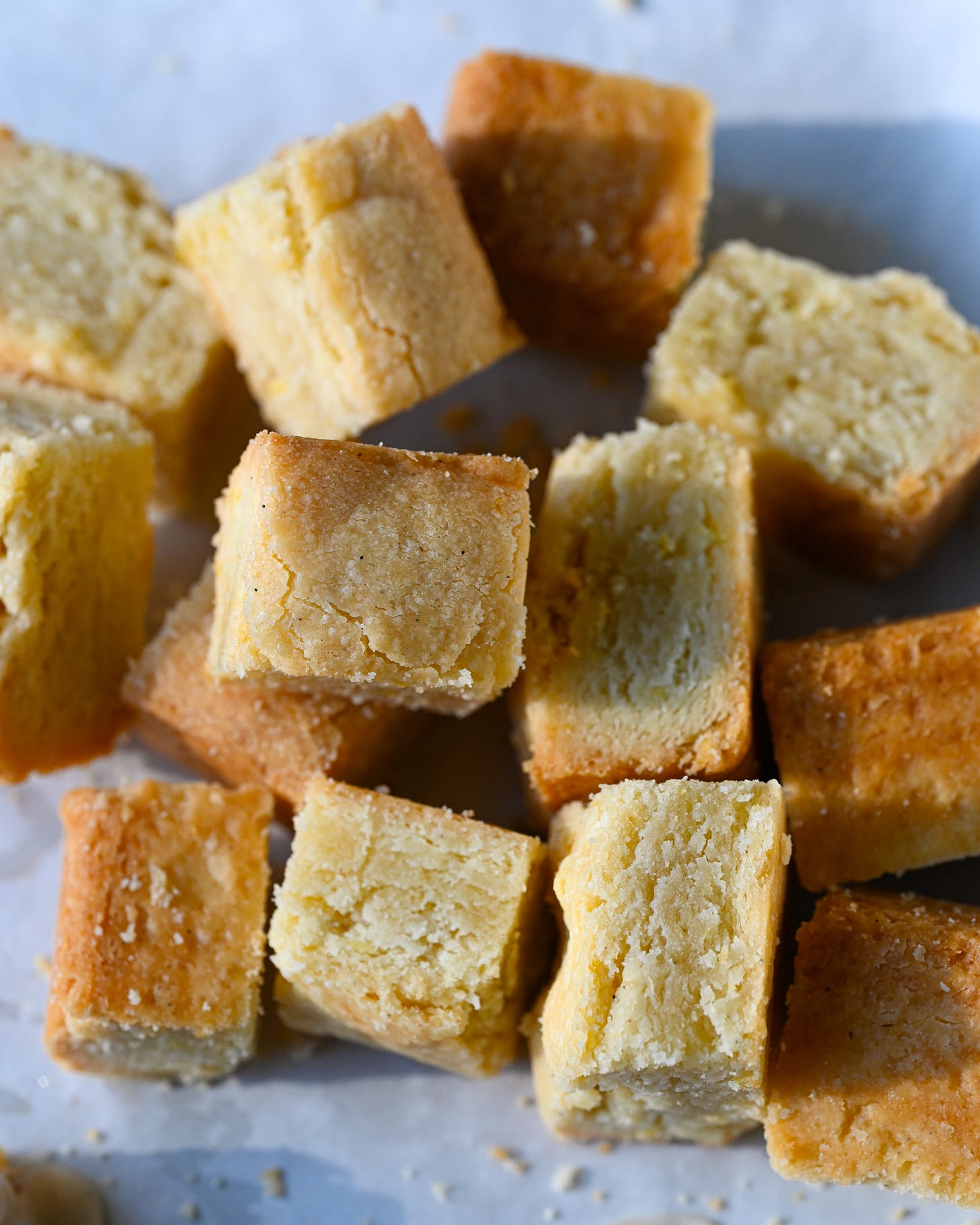 Crumbly, buttery shortbread that bursts with a sweet and tart lemon flavor. These shortbread get their flavor from fresh zest, lemon extract, vanilla paste and high quality butter. The dough is rested twice to enhance the lemony flavor of the shortbread and baked twice for extra crispness.
