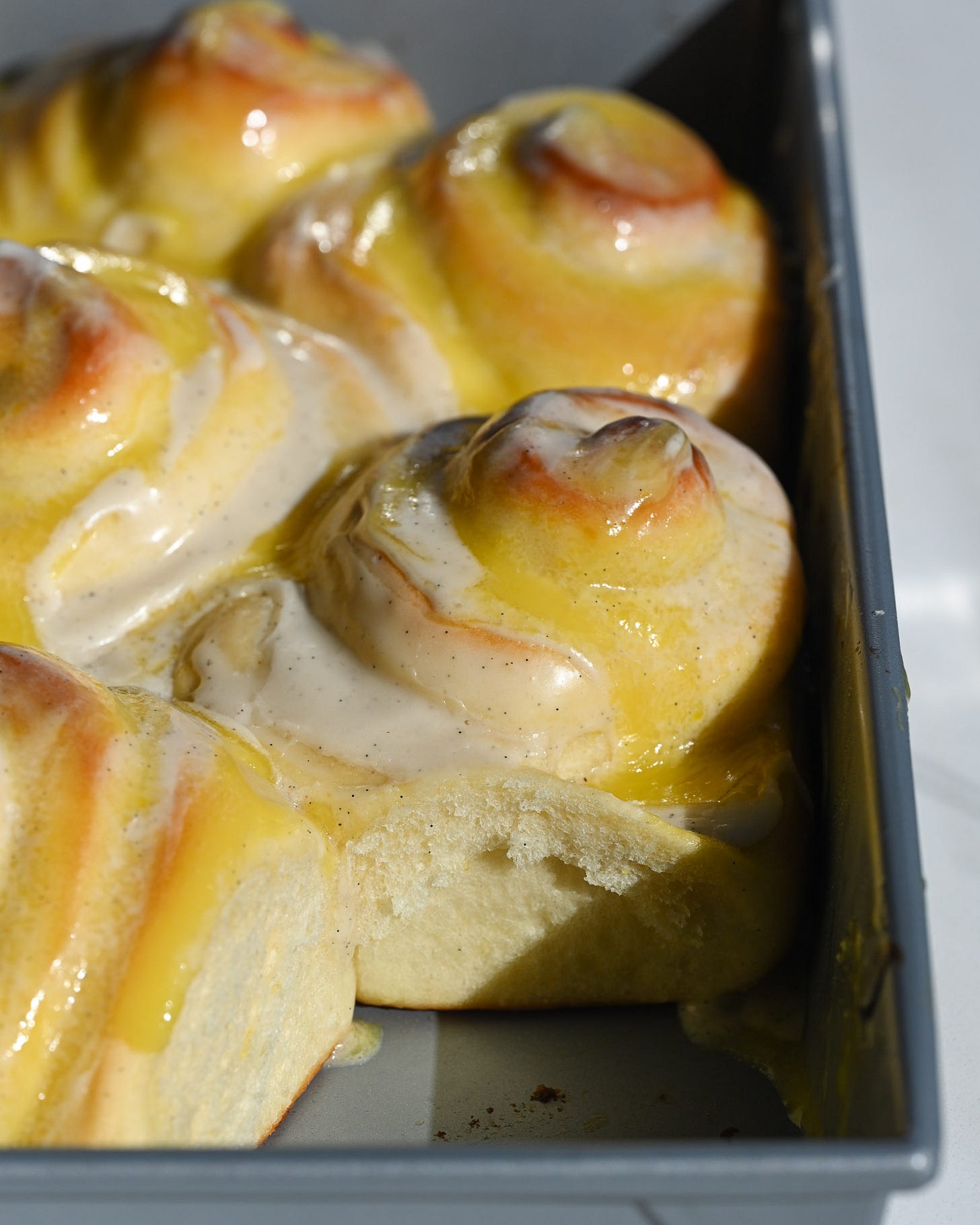Milk bread dough + lemon curd + a heavy cream bath… then a glaze and more lemon curd on top. It’s a DREAM lemon roll.
